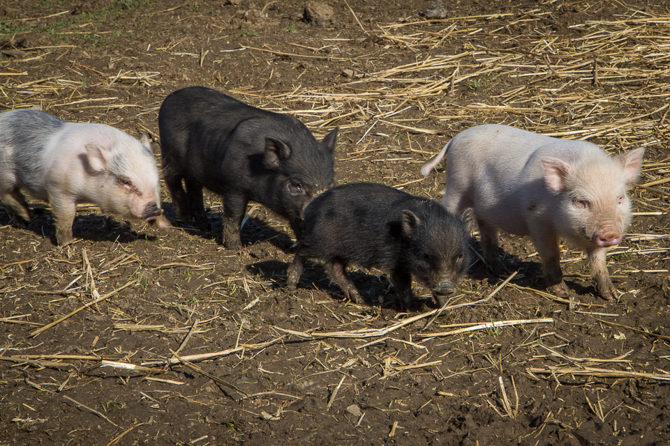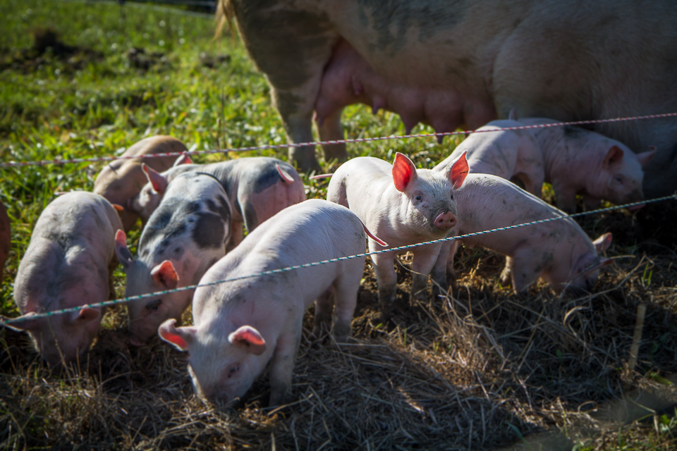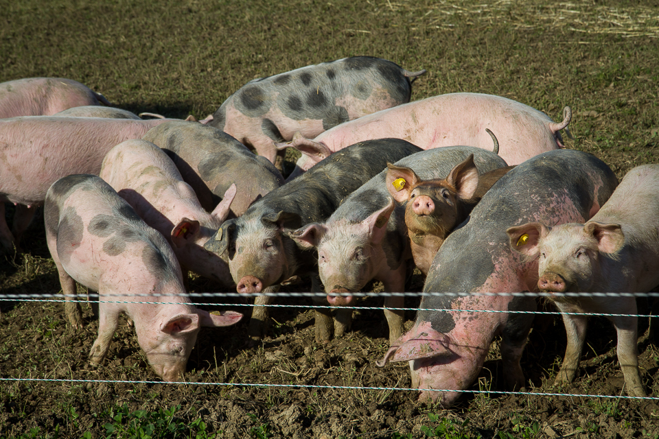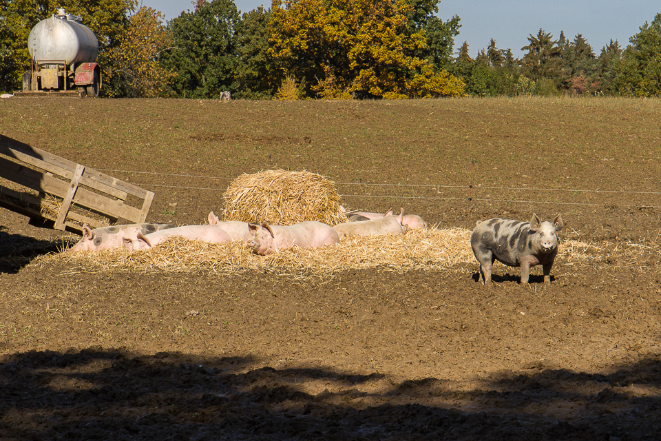 Das Bild das sich bei Freilandschwein-Bauer Josef im Waldviertel zeigt, ist wahrhaft ein idyllisches. Neben vier Zuchtgehegen mit ganzen Rudel kleiner Ferkerl, gibt es einen großen Freiland-Acker, auf dem sich Schweine im Alter von 3 bis 9 Monaten tummeln. In dieser Zeit kommen sie auf ein Gewicht von bis zu 120 Kilogramm und das nicht durch spezielles Kraftfutter, sondern natürliches Getreide, viel frische Luft und Platz zum Laufen und Herumtollen. Jede Schweinegruppe bekommt einen frischen Acker, denn jedes Schwein soll Gelegenheit haben, vom grünem Klee zu naschen oder genüsslich mit dem Rüssel in der weichen Erde zu wühlen. Denn das ist ihr Urinstikt, ursprünglich ernährten sich Schweine hauptsächlich von Engerlingen und anderen Insekten. Scheu vor dem Menschen kennen sie nicht, vielmehr kommen sie neugierig angelaufen und zeigen ihren Spieltrieb. Die Tiere sind das ganze Jahr am Feld, sie rasten auf einem Bett aus Stroh und übernachten wenn es kühler wird in fahrbaren Hüttchen. Ein Tierarzt ist da nur selten nötig, die Abwehrkräfte der Tiere sind stark. Wenn dann die Zeit da ist, wird auf dem Acker, nach dem Gesetz der Fruchtfolge, wieder Getreide oder Gemüse angebaut. Das gedeiht prächtig, bei all dem natürlichem Dünger.